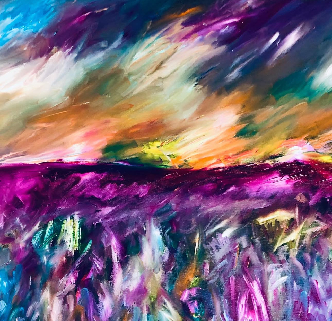 Sometimes I like to dance when I paint, this I believe natures that energy Im seeking to inspire me. I use electronic Music In my studio, this brings me back to my youth when I loved to go out clubbing. I believe its very multi layered genre of Music, with a multitude of styles contained in it. Its always there I find euphoria which I capture for my work , this then remains for me as a record of time. To time stamp that feeling, I use the Music title or a lyric as the name of the artwork, this serves as a record and allows me to communicate with emotion rather than dialogue with the viewer.In my last solo show I supplied the viewer the Music that inspired me to hear while connecting with the piece.